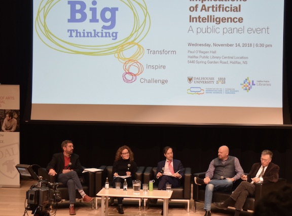 The Big Thinking public panel on the social implications of AI, held at the Halifax Public Library on November 14, was a lively and well attended event. The discussants included Teresa Heffernan, Ian Kerr, Fuyuki Kurasawa and Duncan MacIntosh, with Howard Ramos (Dalhousie) as moderator. A video recording of the event is now available.